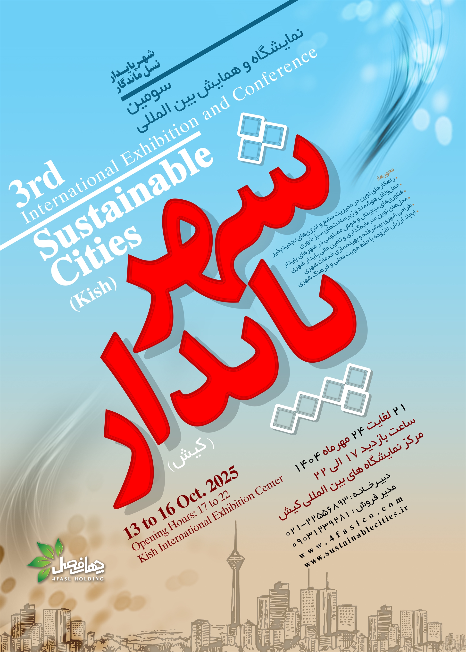 سومین نمایشگاه و همایش بین‌المللی شهر پایدار به عنوان رویداد تخصصی منطقه‌ای در حوزه تاب‌آوری شهری، زیست پذیری و شهرهای هوشمند، توسط شرکت «فرداد سیال چهار فصل» از تاریخ 21 الی 24 مهر ماه 1404 (13 الی 16 اکتبر 2025) در جزیره کیش برگزار می‌ شود. علاقمندان جهت مشارکت و کسب اطلاعات بیشتر و انجام هماهنگی‌های لازم می‌توانند با شماره تلفن: 982122556893+ ، شماره موبایل/ واتساپ: 989912008386+ و ایمیل: info@4faslco.com  و info@sustainablecities.ir  ارتباط گرفته و یا به وبسایت: www.sustainablecities.ir مراجعه نمایند.